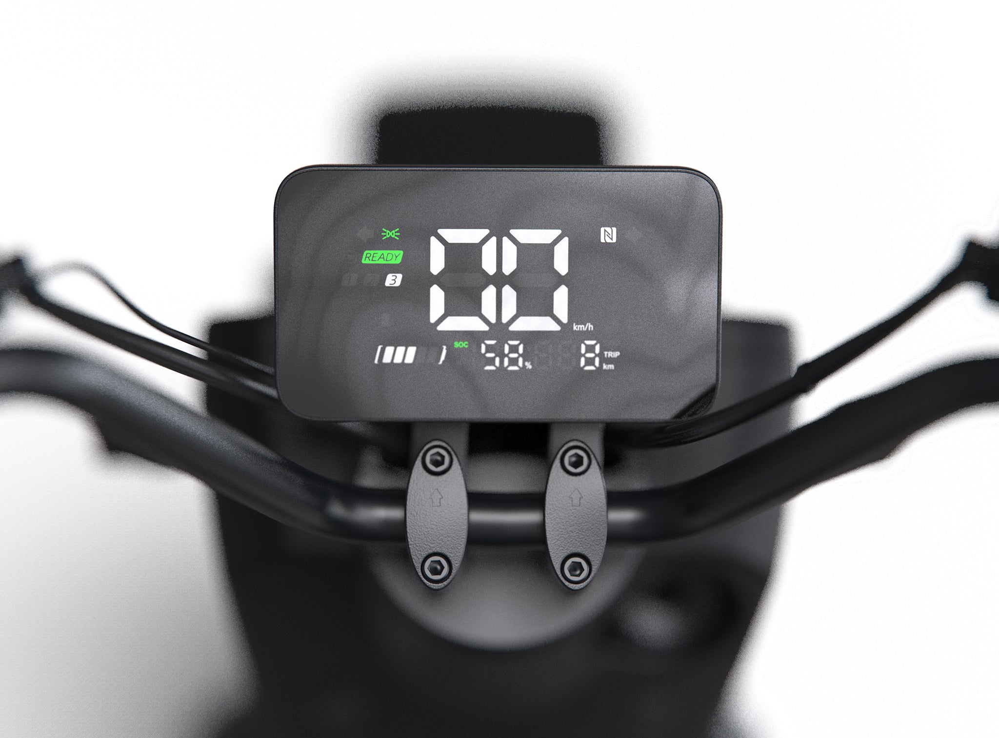 • The range is +100 km with the 50Ah battery or 60 km with the 30Ah. Class 1 or 2, you choose. Motor of 2.6 kW. Keyless start. USB-C mobile charger.